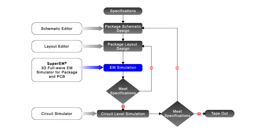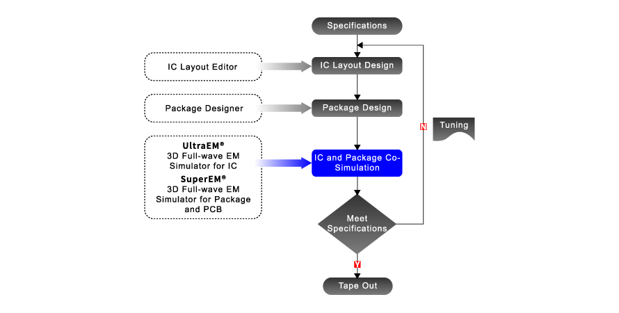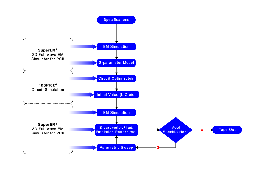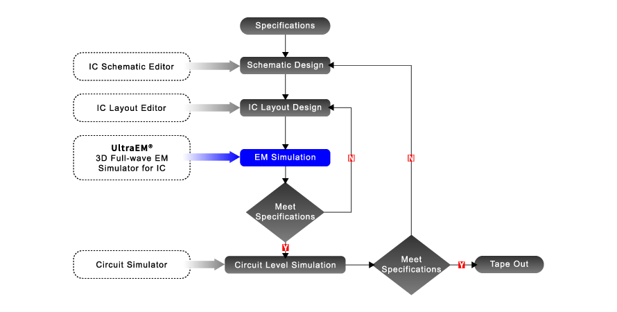 The optimized layout obtained from EMOptimizer? is exported to UltraEM? for rigorous EM simulation and verification. The EM simulation validates that the final layout design meets the design specifications.