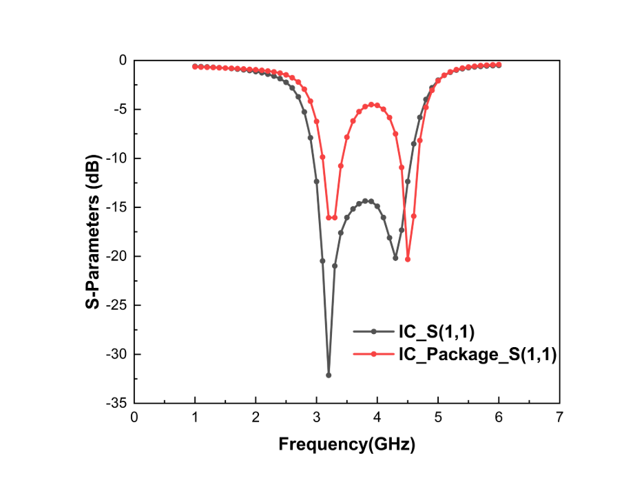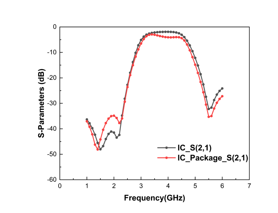分別仿真了芯片不帶封裝和帶封裝兩種應用場景,來分析封裝對芯片濾波特性的影響。添加封裝后濾波器中心頻率及通帶并沒明顯變化,通帶最大衰減由原來的-2dB變?yōu)榱?4dB。得出結論: 封裝效應是芯片設計不得不考慮的重要因素。我們需要通過封裝聯(lián)合仿真的結果調整芯片版圖以達到目標結果。