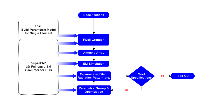 Utilizing the FCell model from one time design, SuperEM? facilitates antenna unit construction, applicable to v arious materials and dimensions. The simulations demonstrate that the antenna array exhibits a return loss of less than 10dB in the 3.5GHz frequency range, coupling between ports is below 15dB, and the scanning gain within 60-degree ranges from 14-15dBi. The performance is exceptional, making it suitable for large scale beam-scanning arrays.