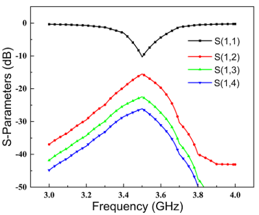 The simulation results and the measured results are compared in the above figure. It shows that the attenuation of the filter within the operating frequency band of 3.3-4.2GHz is not more than -2dB, the coupling between ports is less than -10dB, and the frequency offset is less than 0.1GHz.