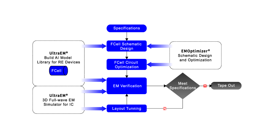 模擬射頻芯片設計通常遵循一系列嚴格的步驟,包括規(guī)格制定、電路設計、仿真和優(yōu)化、布局設計、物理驗證等。芯片設計工程師需要使用專業(yè)仿真工具和器件模型,以確保設計滿足性能和可靠性要求。本案例使用法動科技的EDA解決方案完成一個代表性的功率放大器設計。