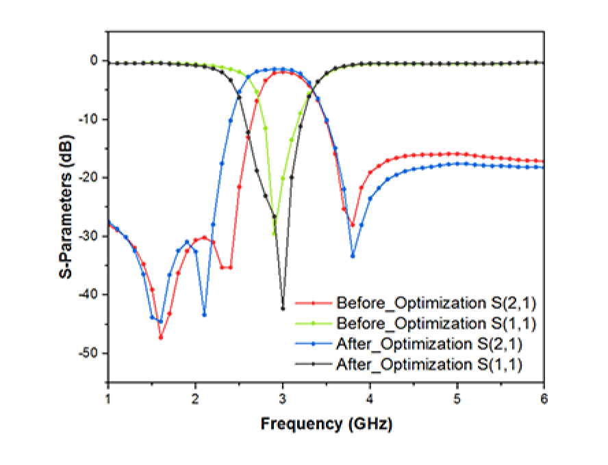 The figure depicts the simulation results of the designed filter before and after EMOptimizer? performs optimization. After optimization, the passband increases from 2.85GHz-3.1GHz to 2.7GHz-3.1GHz, the insertion loss is reduced by 0.8 dB, and the return loss increases by 9 dB。