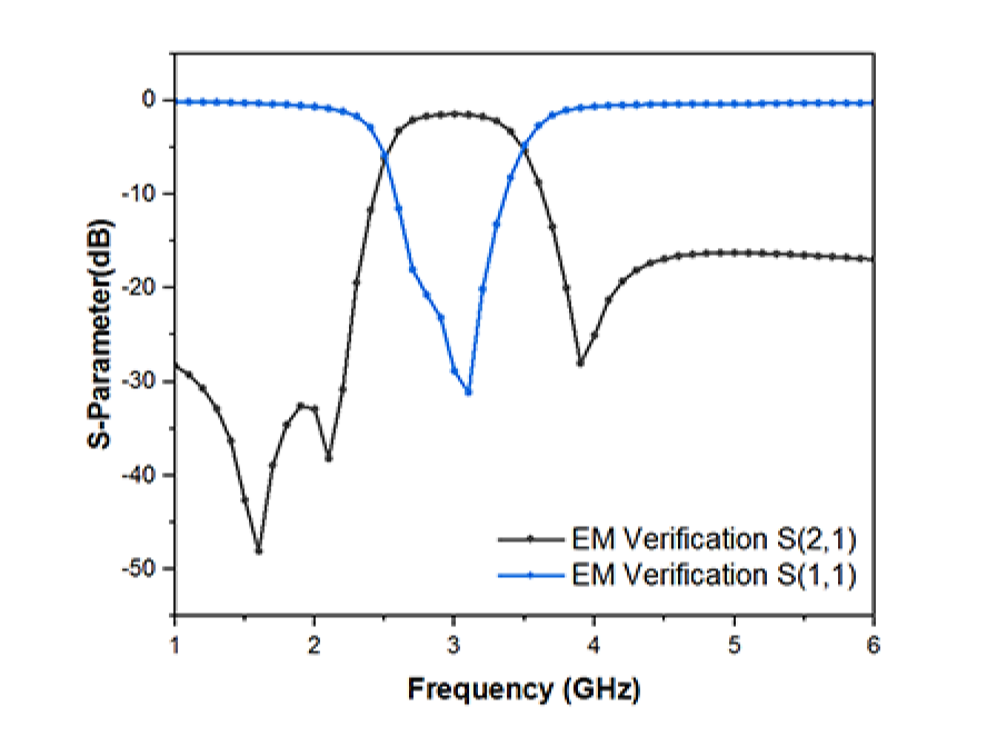 UltraEM?, the 3D Full-wave EM Simulation software from Faraday Dynamics, Ltd., is designed to analyze the electromagnetic field effects of RF/microwave IC and high-speed digital IC layouts. It can be seamlessly integrated with the industry's leading analog chip design environments to provide high-precision electromagnetic analysis services for designers. This reference case demonstrates the simulation task of a 5G bandpass filter design using a gallium arsenide process, that operates at a frequency range from 3.3GHz to 4.2GHz, a center frequency of 3.8GHz, and a maximum passband attenuation of -2dB.