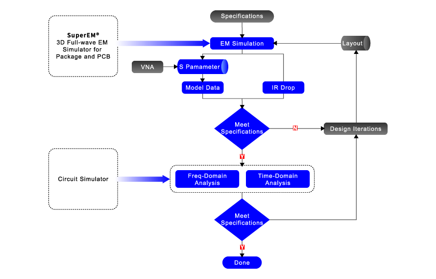 Signal Integrity (SI) analysis evaluates the transmission and reflection of signals in packages and circuit boards to ensure that the signal quality is within normal limits. SI analysis typically includes time domain simulation, which is used to evaluate waveforms and reflections on transmission lines, and frequency domain simulation, which is used to evaluate the frequency response and bandwidth of signals. Power Integrity (PI) analysis evaluates the impact of power supply noise and power supply interference on circuit performance for power supply design optimization. Faraday Dynamics offers cutting-edge 3D full-wave electromagnetic simulation technology and frequency-/time-domain circuit simulation algorithms for engineers to perform simulation analysis and optimize package and PCB design. They seamlessly integrate with the industry's leading package and board design environments to provide high-precision analysis services to a wide range of designers.